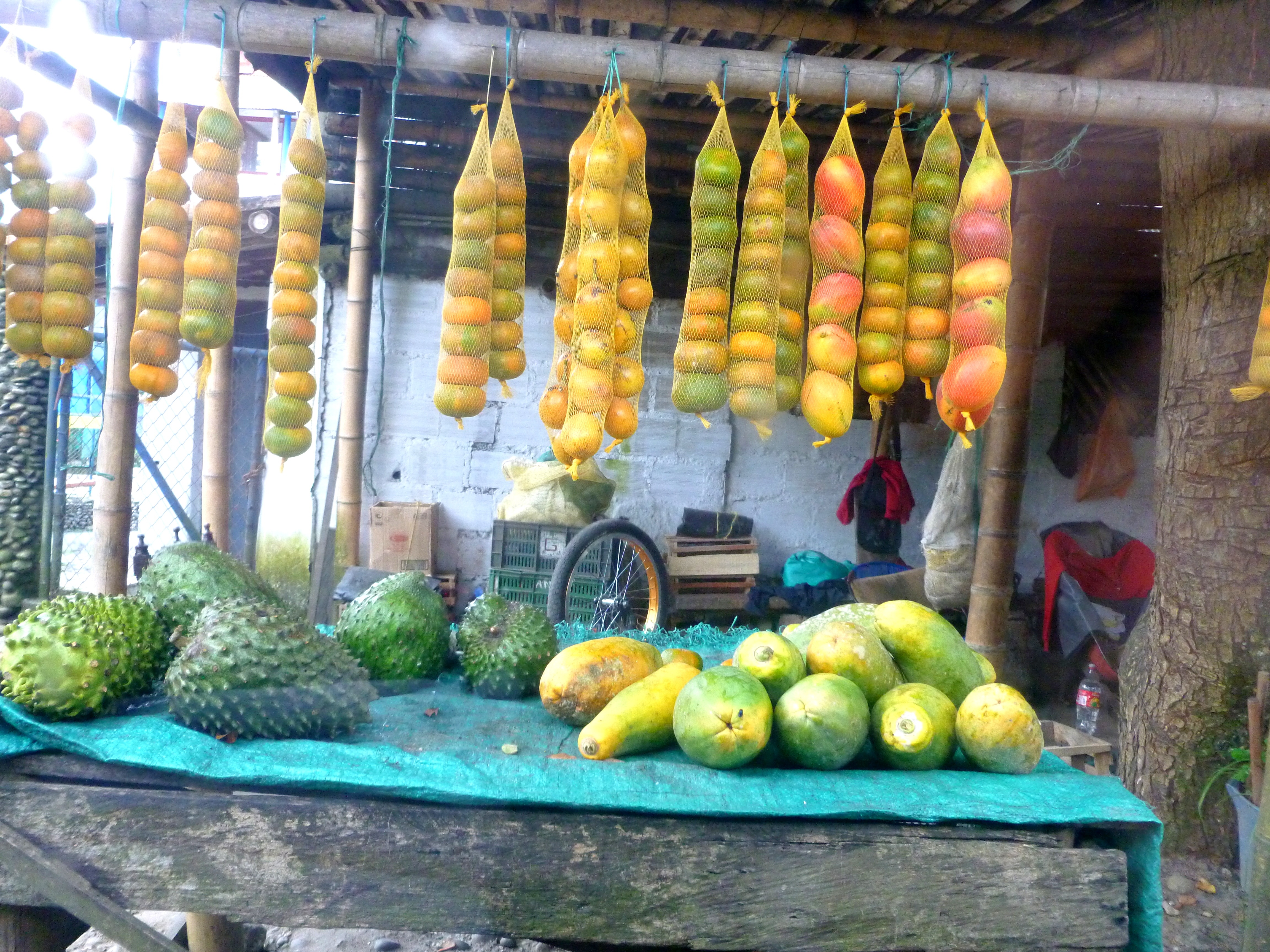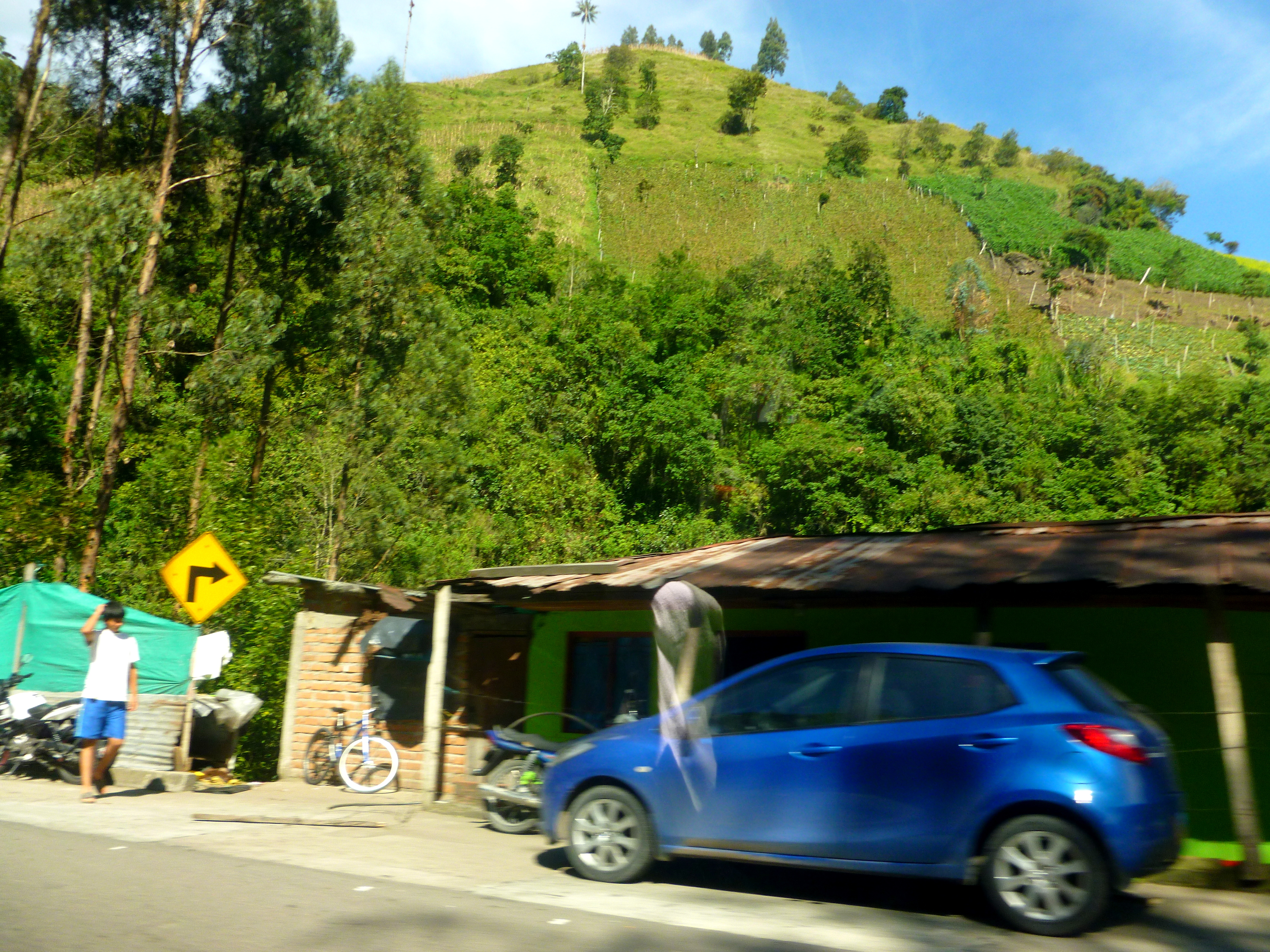 The road was lined, when not deserted entirely, by these homes, or small towns/villages/groups of houses. Clusters of houses, here, on the side of the mountains, should probably be more accurately described (to our first-world, Western ears) as shanty-towns, kind of like what you might imagine Laura Ingalls Wilder and her family lived in all those years ago when they finally resettled out West, and before they had the money to move into town during the winter, or to build a more substantial log house in the Ozarks. I’ll do a post one day on housing in Colombia, because it varies widely (as in the USA, but drop the luxury bar a few notches down).
