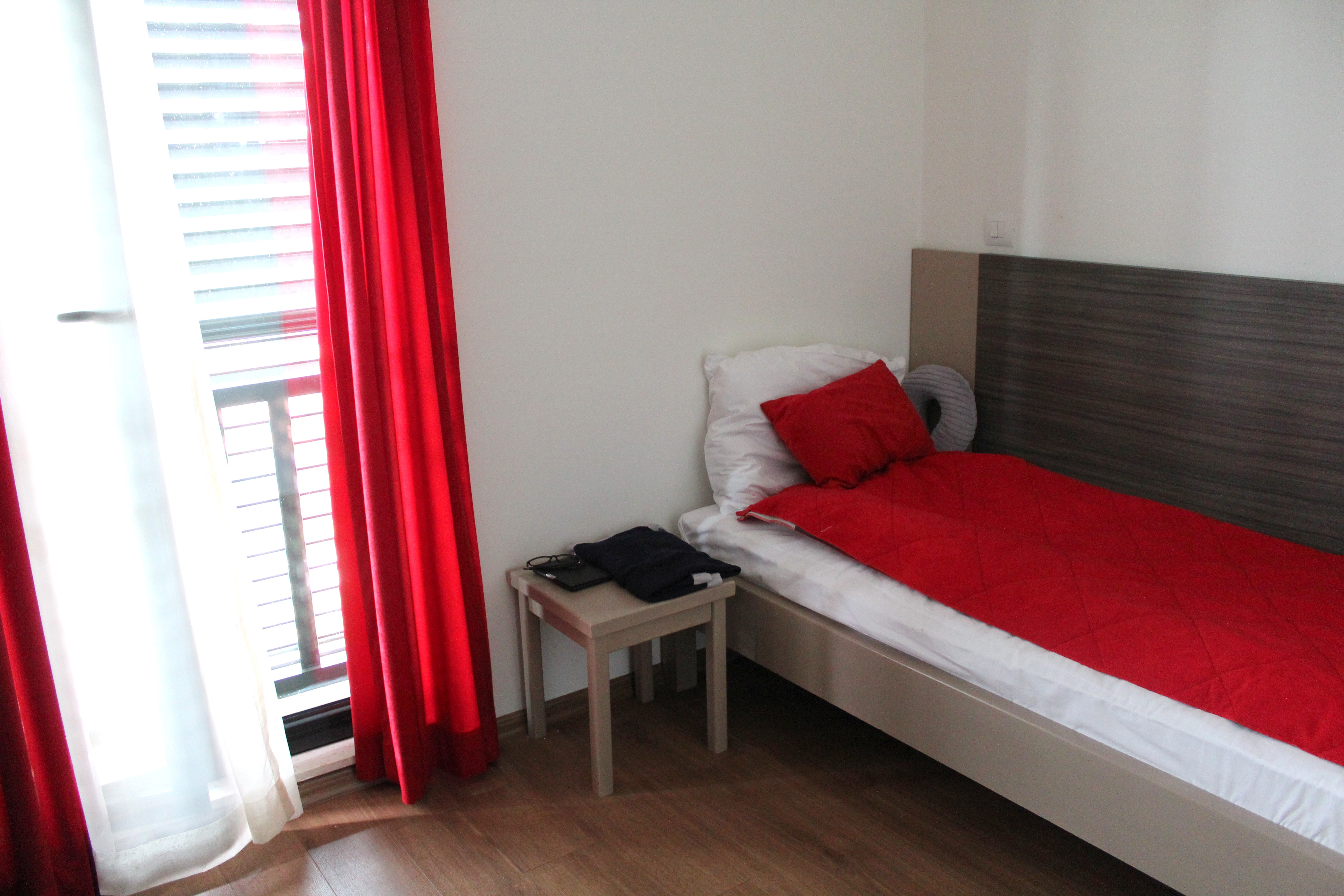 Yesterday was my first full day here and, though I’ve never had problems with jet lag going forward in time before, I seem to have something of the sort here. I went to bed at 11:00 pm and woke up at 3:00 am, unable to sleep, so I downloaded The Orphan Master’s Son by Adam Johnson and read until 7:00 am, when I went back to sleep until 9:00. It’s actually quite good, and I’d recommend this one (albeit I’m only half-way through), unlike The Tusk That Did the Damage (I wouldn’t recommend it to anyone). This is my room: