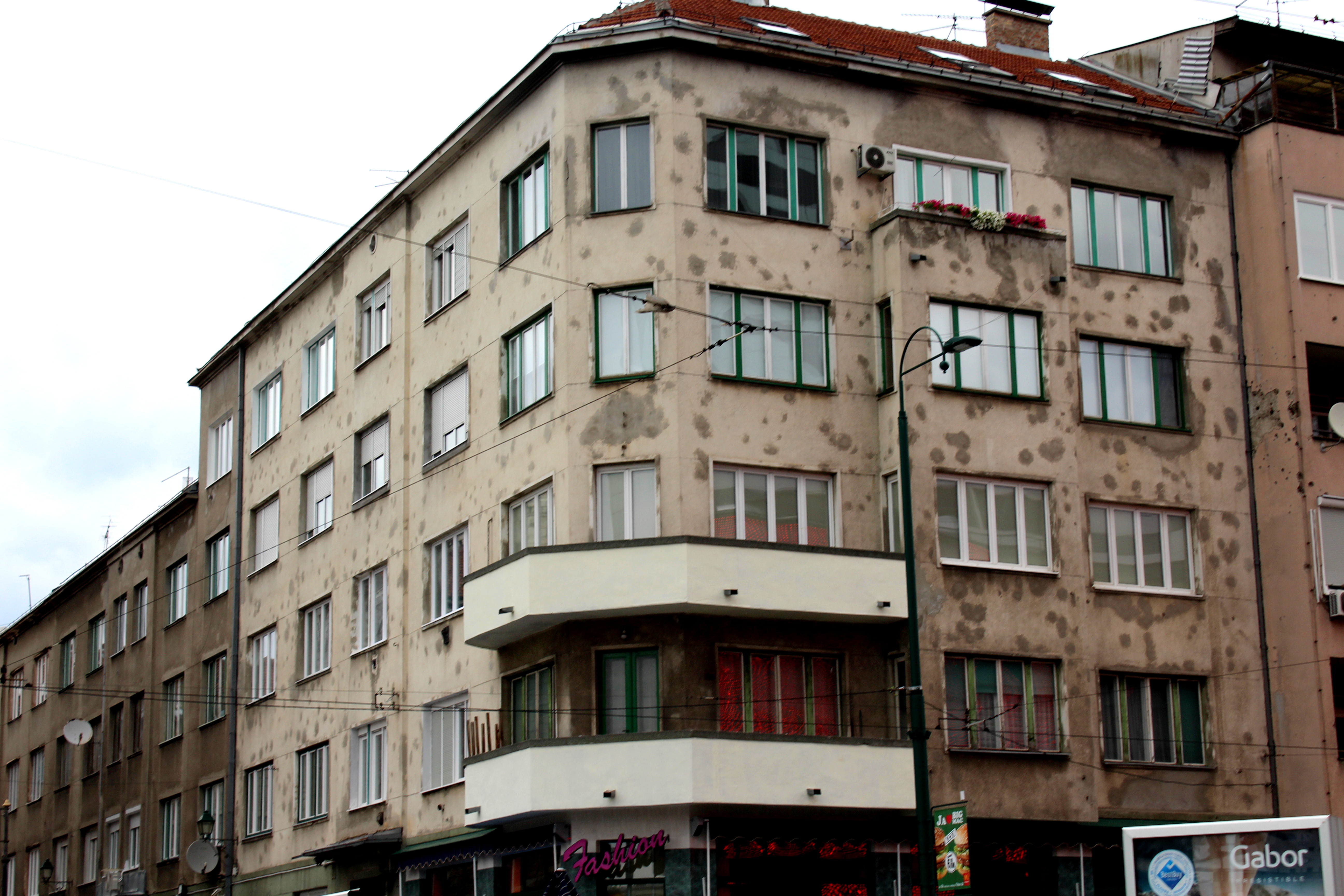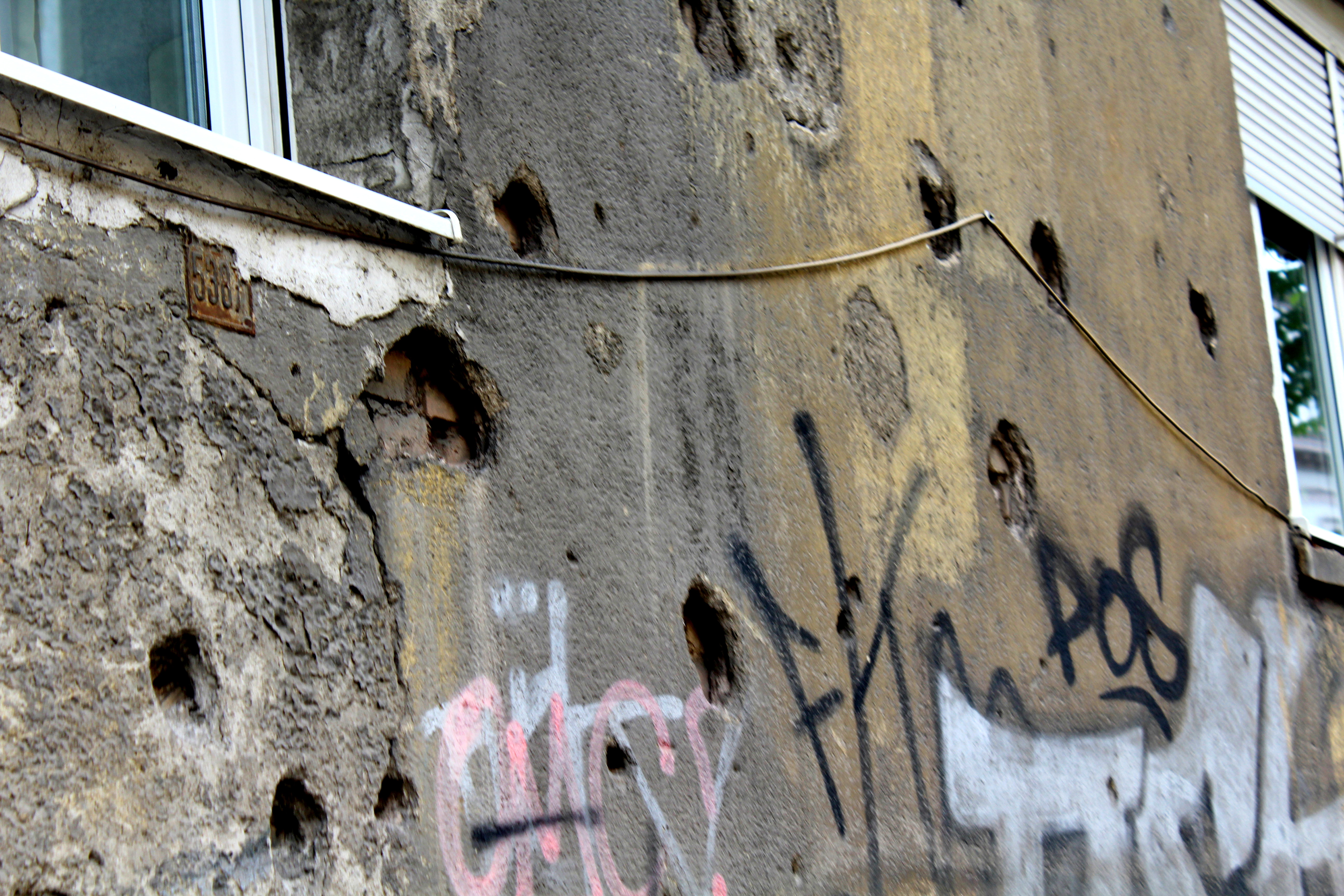 On every building you can see bullet holes and shrapnel scars, though some have been patched up and others have been left gaping if they haven’t imperatively damaged the structural integrity itself. Most apartment buildings that survived the conflict have trademark wooden balconies built afterwards and telling segments of different-colored stone or lime where it was patched up to be functional as a residence again.