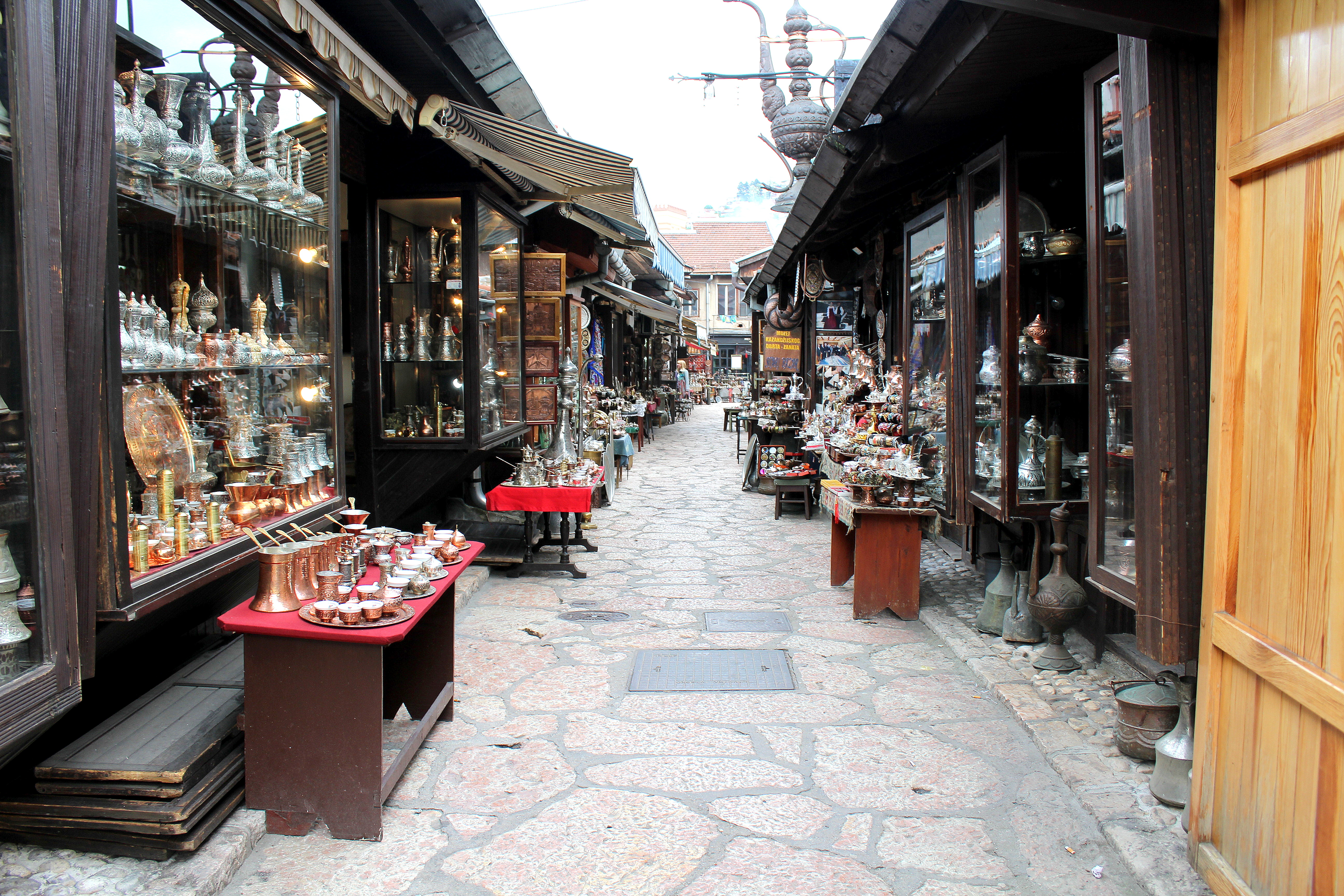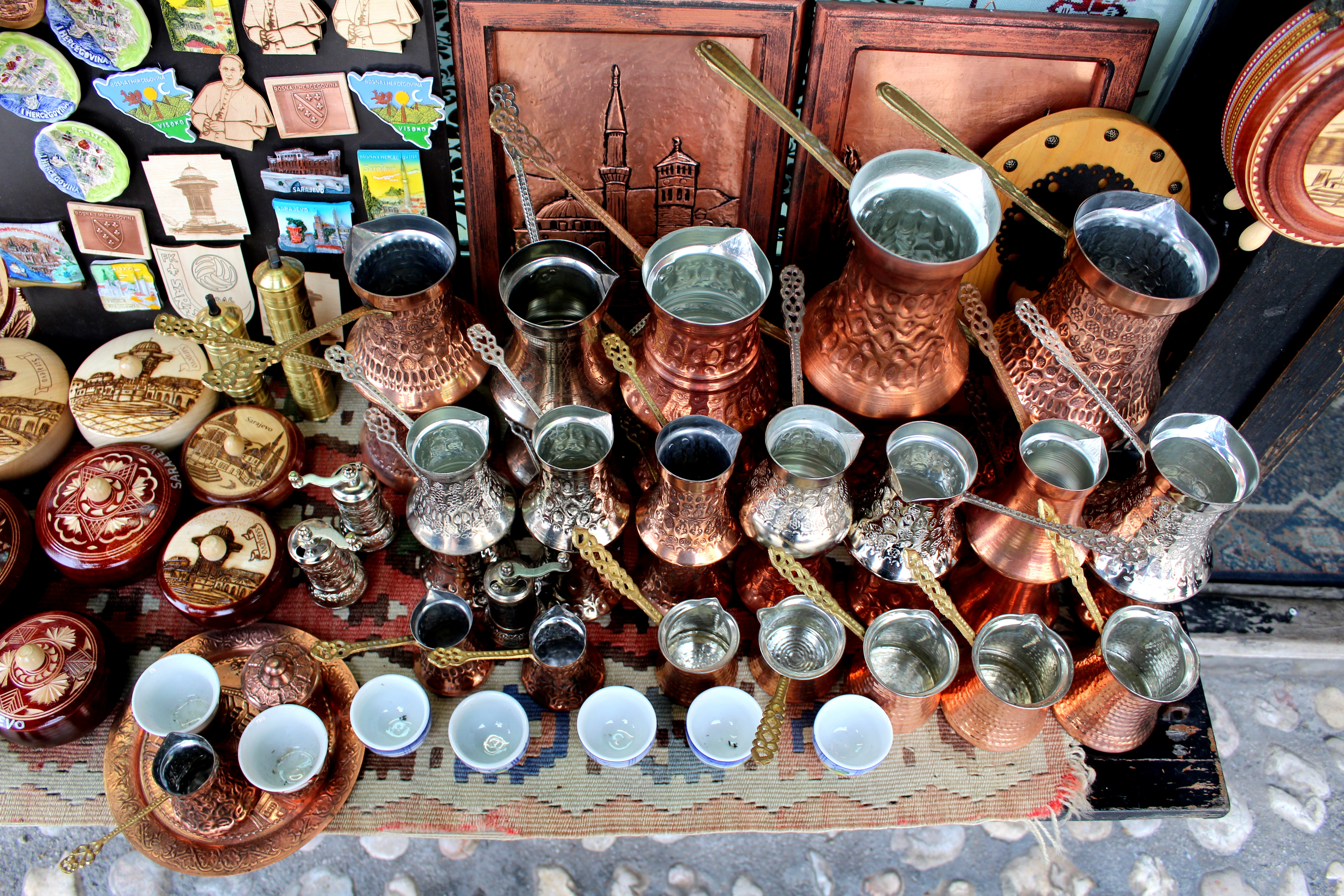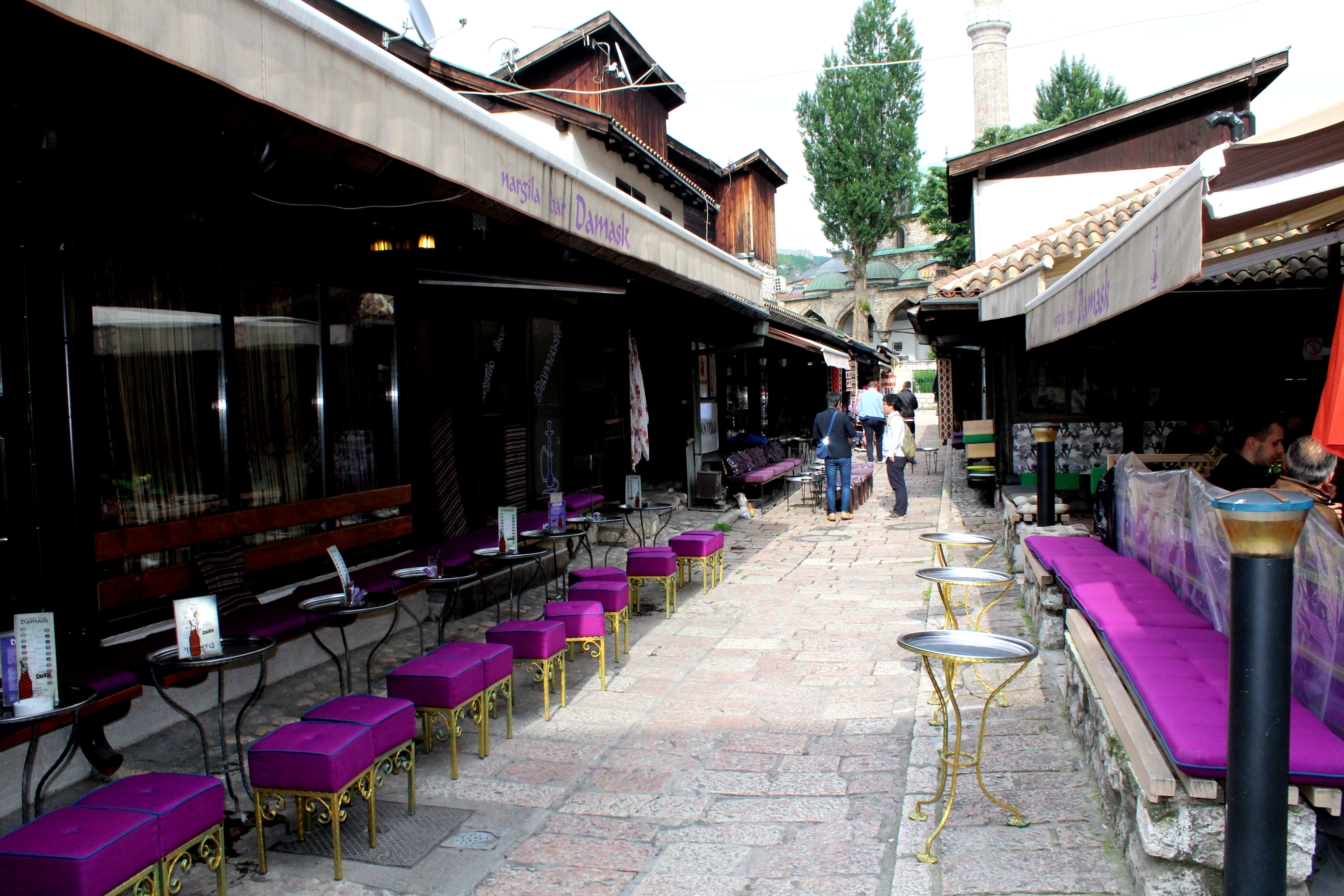 And then we found the market, which was my favorite part! Historically Sarajevo was the meeting place of cultures and had four Guilds: the Copper Guild, the Gold Guild, I think the Silver Guild, and the Tailoring Guild. This area still boasts wares made using old techniques. Below is the outside of a mosque (I need to research the significance of the water they’re all drinking) and a purple coffee/hookah patio, which, if you know me, know that it was my favorite place of the day. I’m already drawing inspiration for my library.