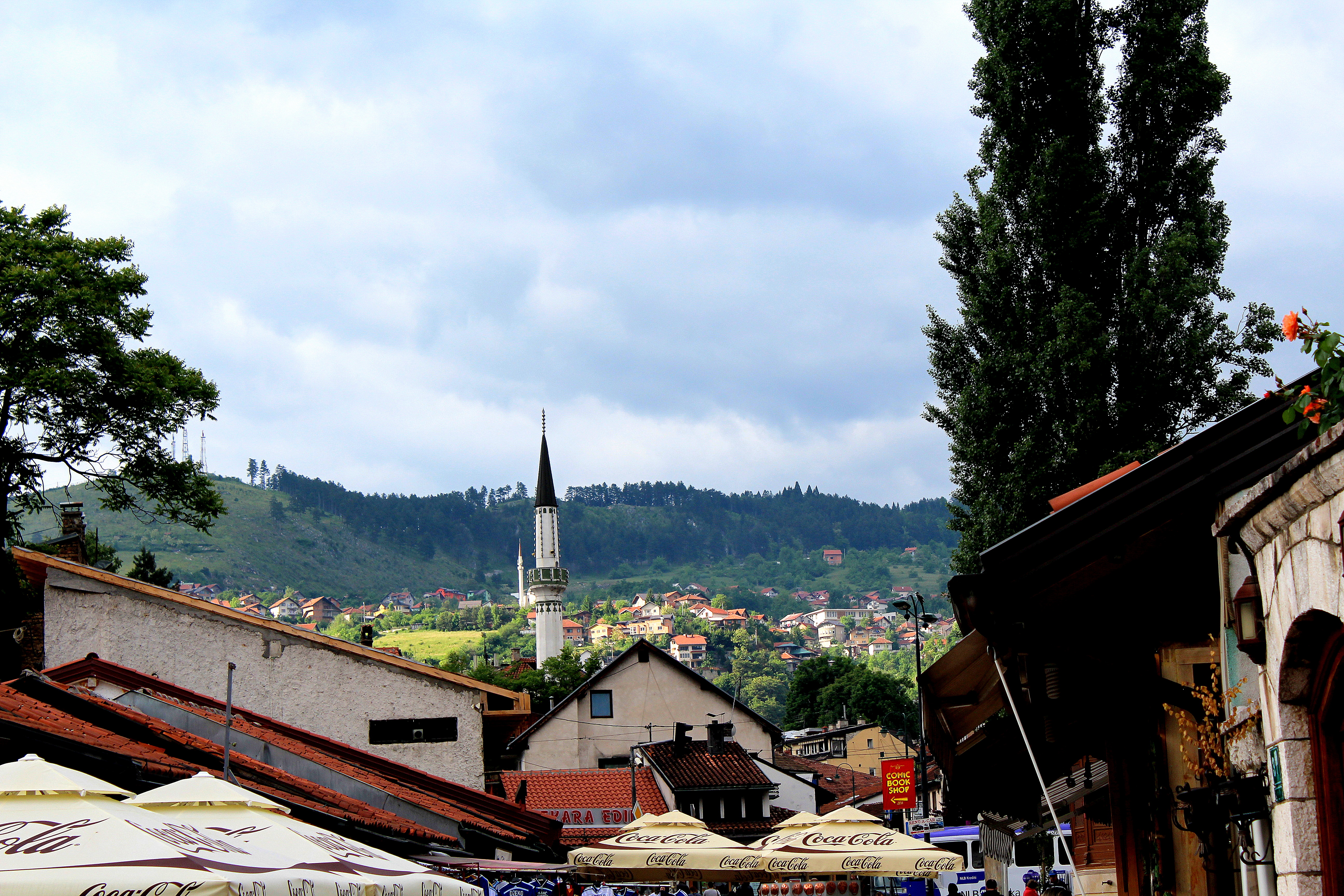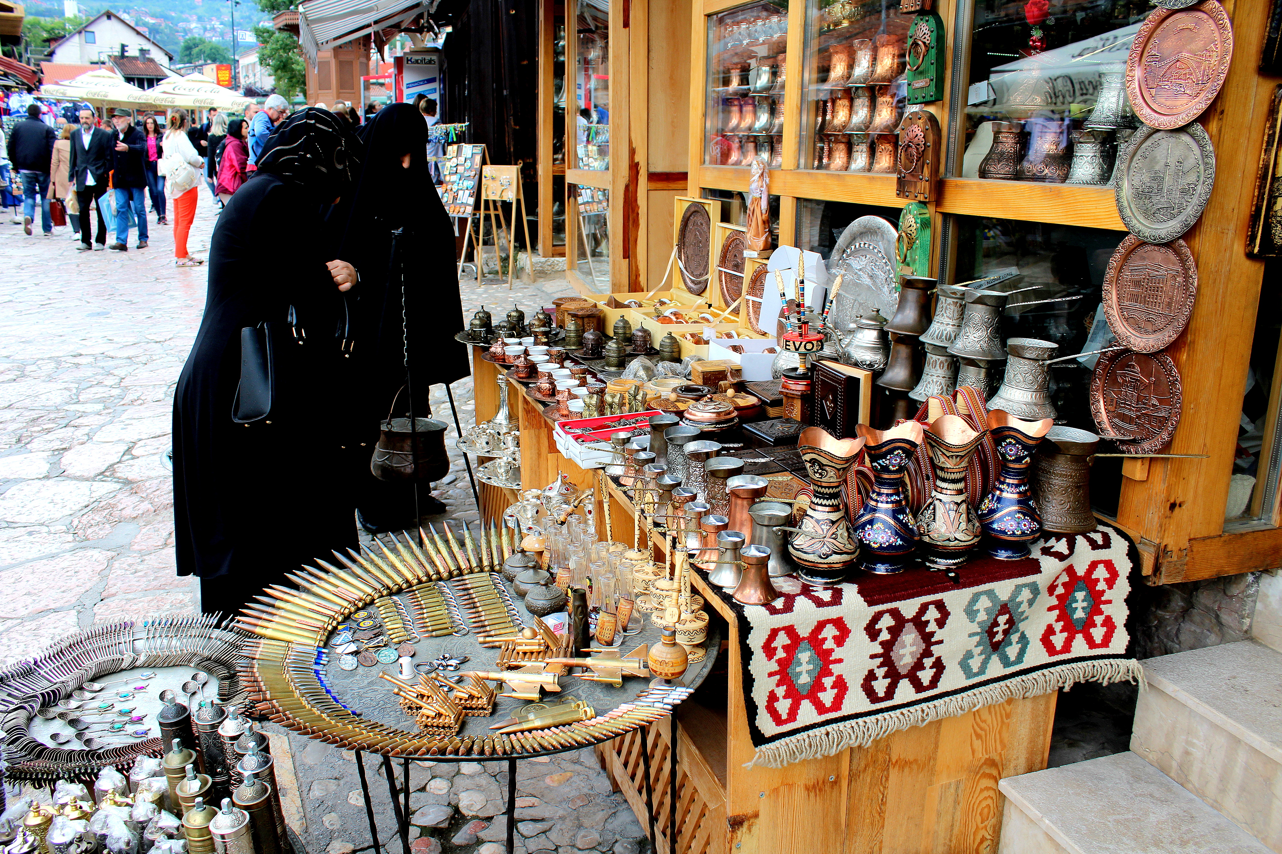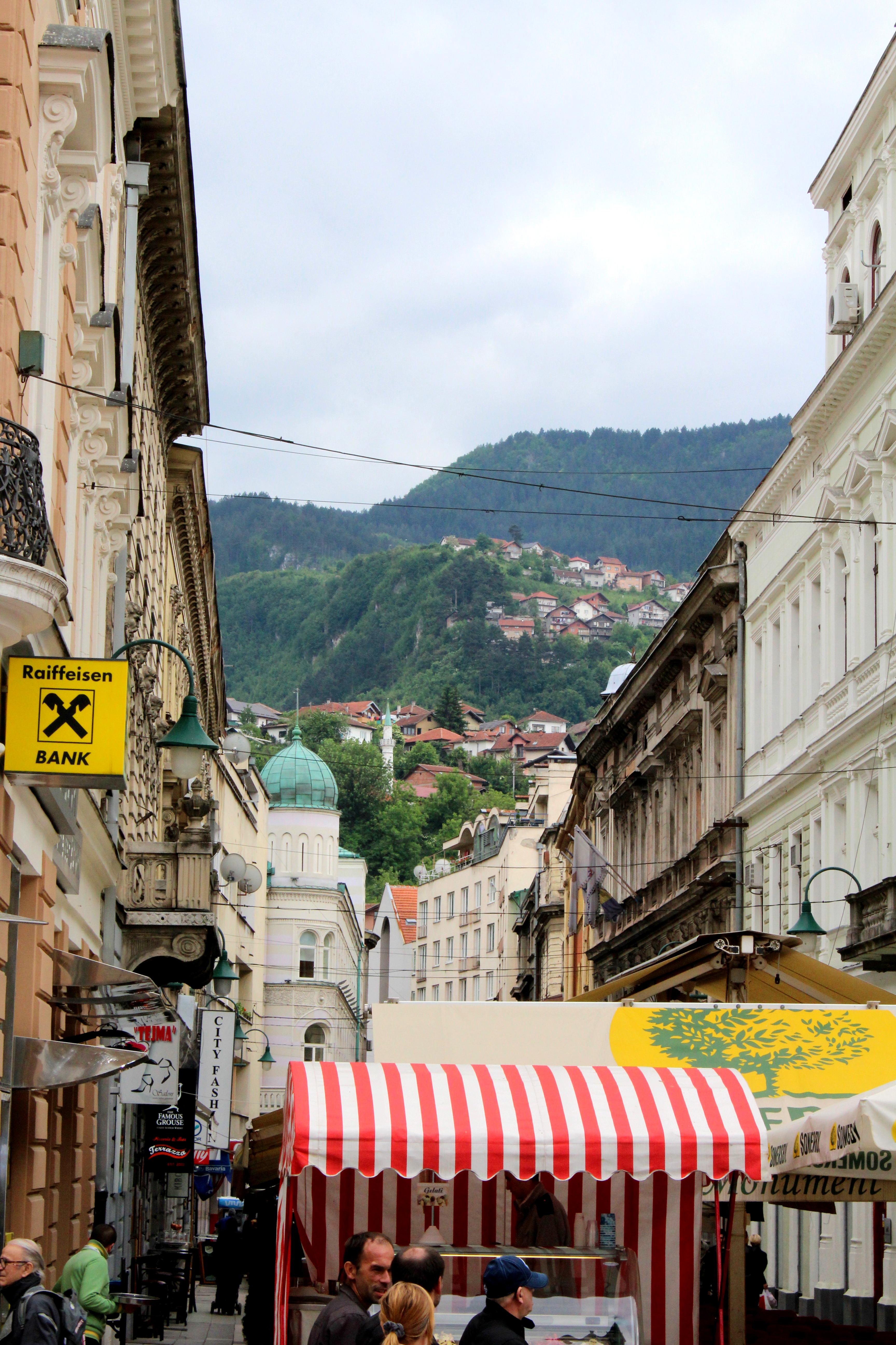 And then we found the market, which was my favorite part! Historically Sarajevo was the meeting place of cultures and had four Guilds: the Copper Guild, the Gold Guild, I think the Silver Guild, and the Tailoring Guild. This area still boasts wares made using old techniques. Below is the outside of a mosque (I need to research the significance of the water they’re all drinking) and a purple coffee/hookah patio, which, if you know me, know that it was my favorite place of the day. I’m already drawing inspiration for my library.