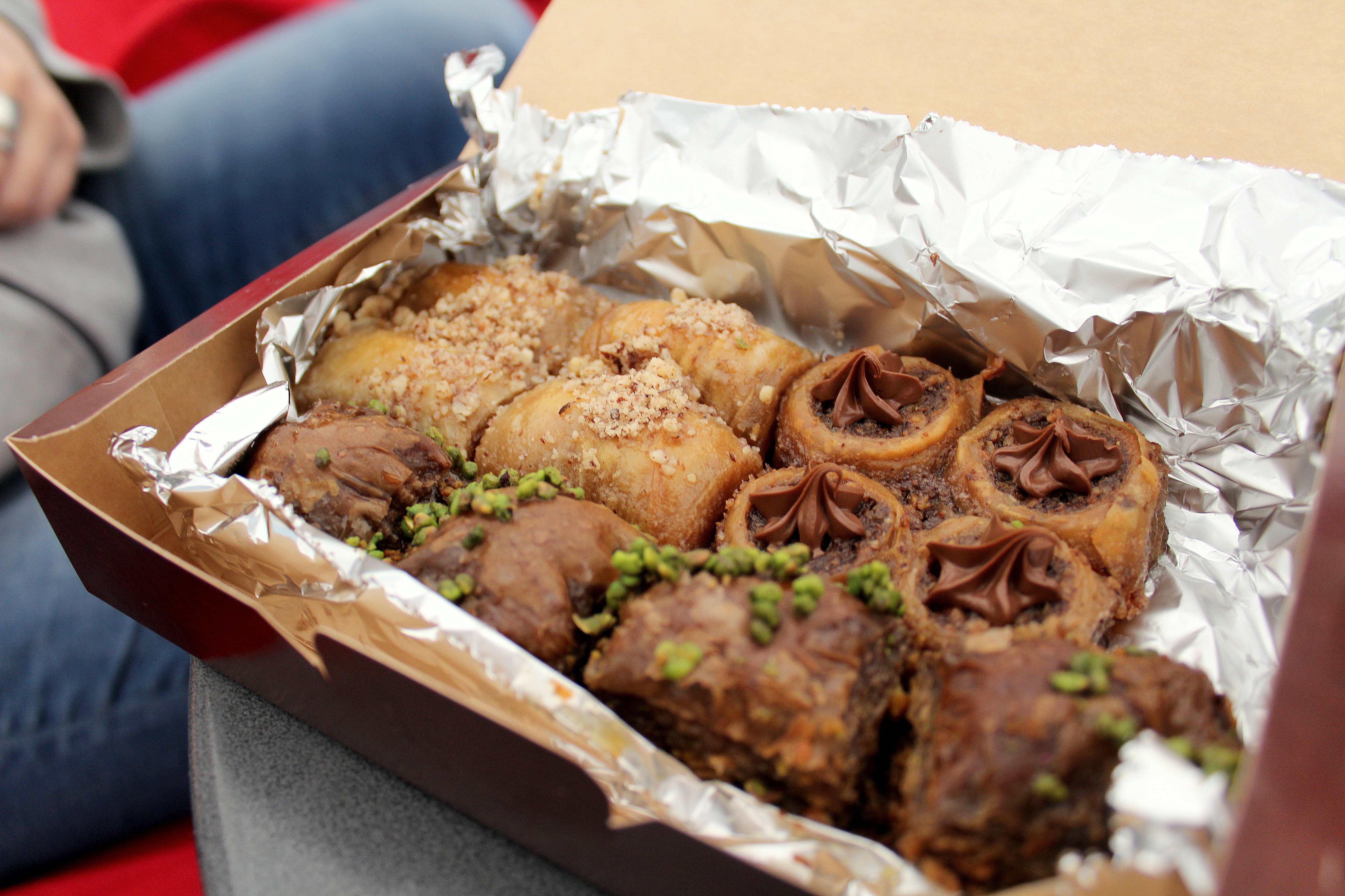 This was beyond the best baklava I have ever had… the top left kind is hazelnut, rolled phyllo- deliciously flaky and dripping with cinnamon-ed honey. The top right kind, my personal favorite, was Nutella baklava, phyllo stuffed with hazelnuts, nutella, cinnamon, nutmeg, and a variety of other things that formed a nutella-chocolate-nutty paste that was out of this world. We probably should have saved that one for last, though, because the bottom row- chocolate pistachio in traditional phyllo layers- was not as good in comparison, though it was dripping honey to the degree that the phyllo practically melted apart. Until tomorrow! -Kris